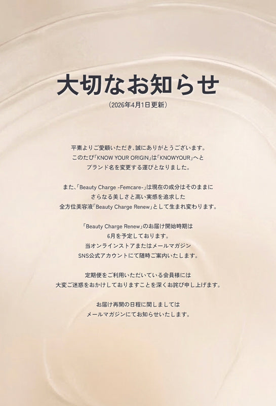 もっと読む平素よりご愛顧いただき、誠にありがとうございます。 このたび「KNOW YOUR ORIGIN」は「KNOWYOUR」へとブランド名を変更する運びとなりました。また、全身美容液「Beauty Charge -Femcare-」は現在の成分はそのままに、さらなる美しさと高い実感を追求し、「Bea...
